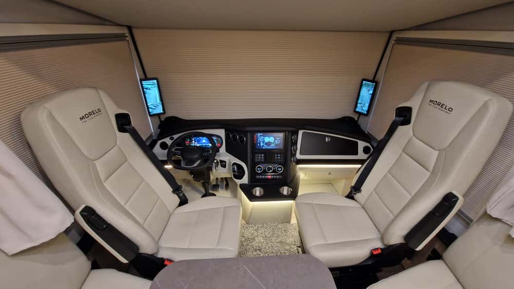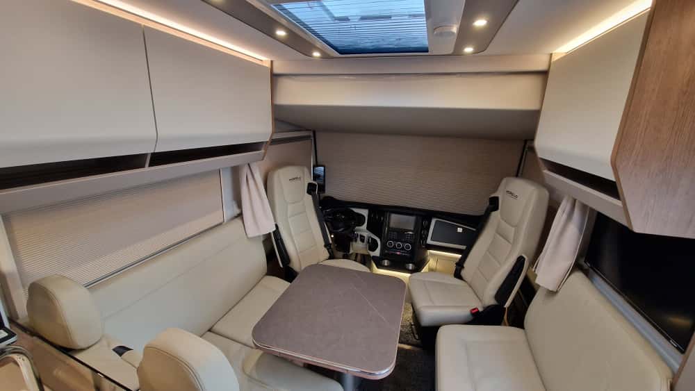 W Morelo Home 82M znajdziemy nowoczesne wnętrze wysokiej jakości materiały wykończeniowe, takie jak skóra naturalna, drewno i eleganckie fronty czy blaty. Kuchnia jest wyposażona w sprzęt AGD renomowanych marek, na przykład lodówkę z dużą pojemnością, piekarnik czy ekspres do kawy. W strefie dziennej jest sofa oraz rozkładane i obrotowe fotele, a także telewizor z systemem kina domowego. W sypialni natomiast mamy ogromne łóżko królewskie z materacem o wysokim standardzie, liczne szafki i schowki, a także klimatyzację postojową, ogrzewanie ALDE, które zapewniają komfort w każdych warunkach.