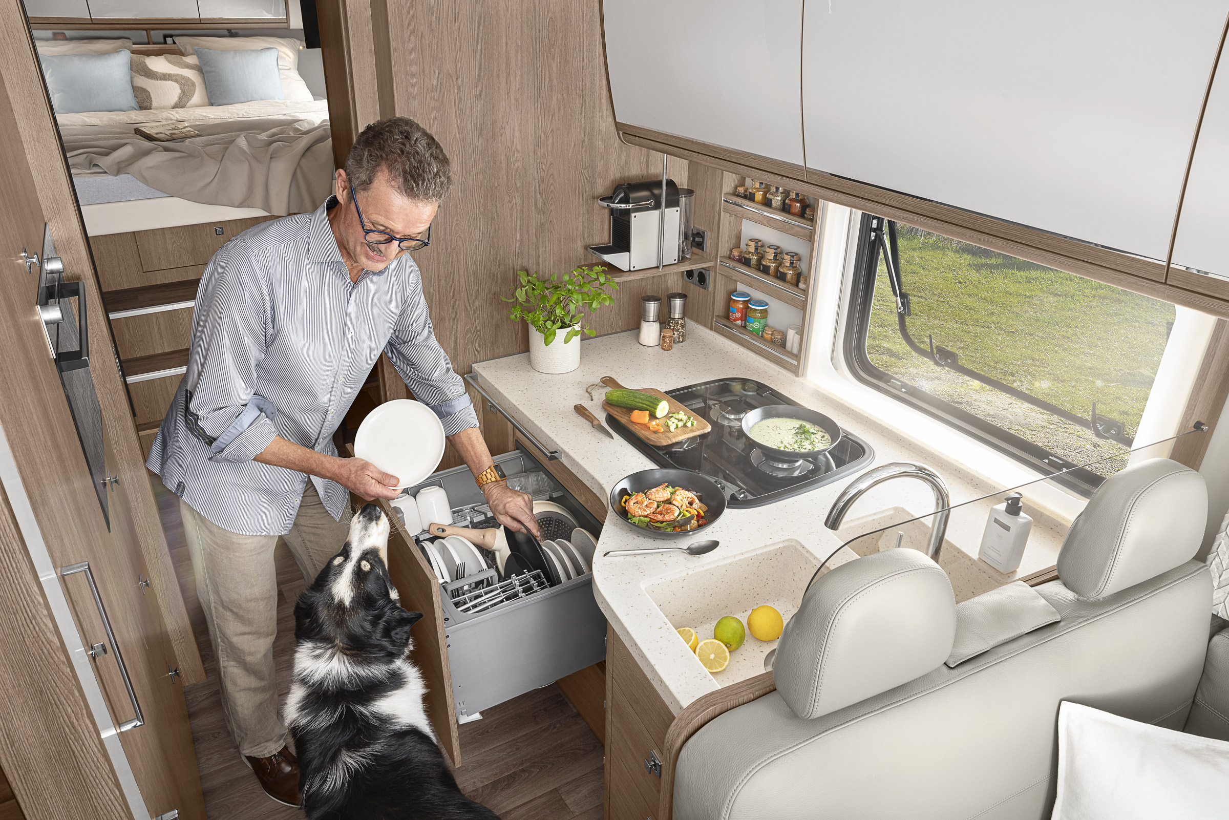 Kamper Morelo Palace Liner 110 GSB, to bardzo luksusowy i bogato wyposażony pojazd, który oferuje wiele funkcjonalnych rozwiązań oraz najwyższej jakości sprzęt i urządzenia. Model ten posiada w pełni wyposażoną kuchnię, w której znajdują się m.in.: duża lodówko-zamrażarka, kuchenka indukcyjna, kuchenka mikrofalowa z funkcją piekarnika, zlewozmywak, zmywarka, szuflady i szafki na naczynia i akcesoria kuchenne.
