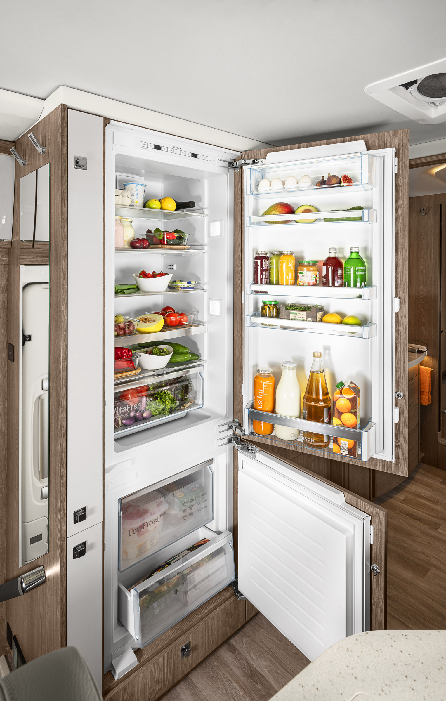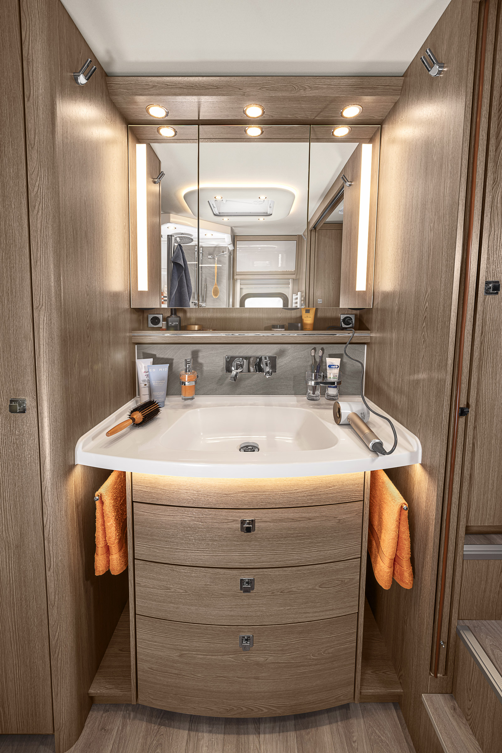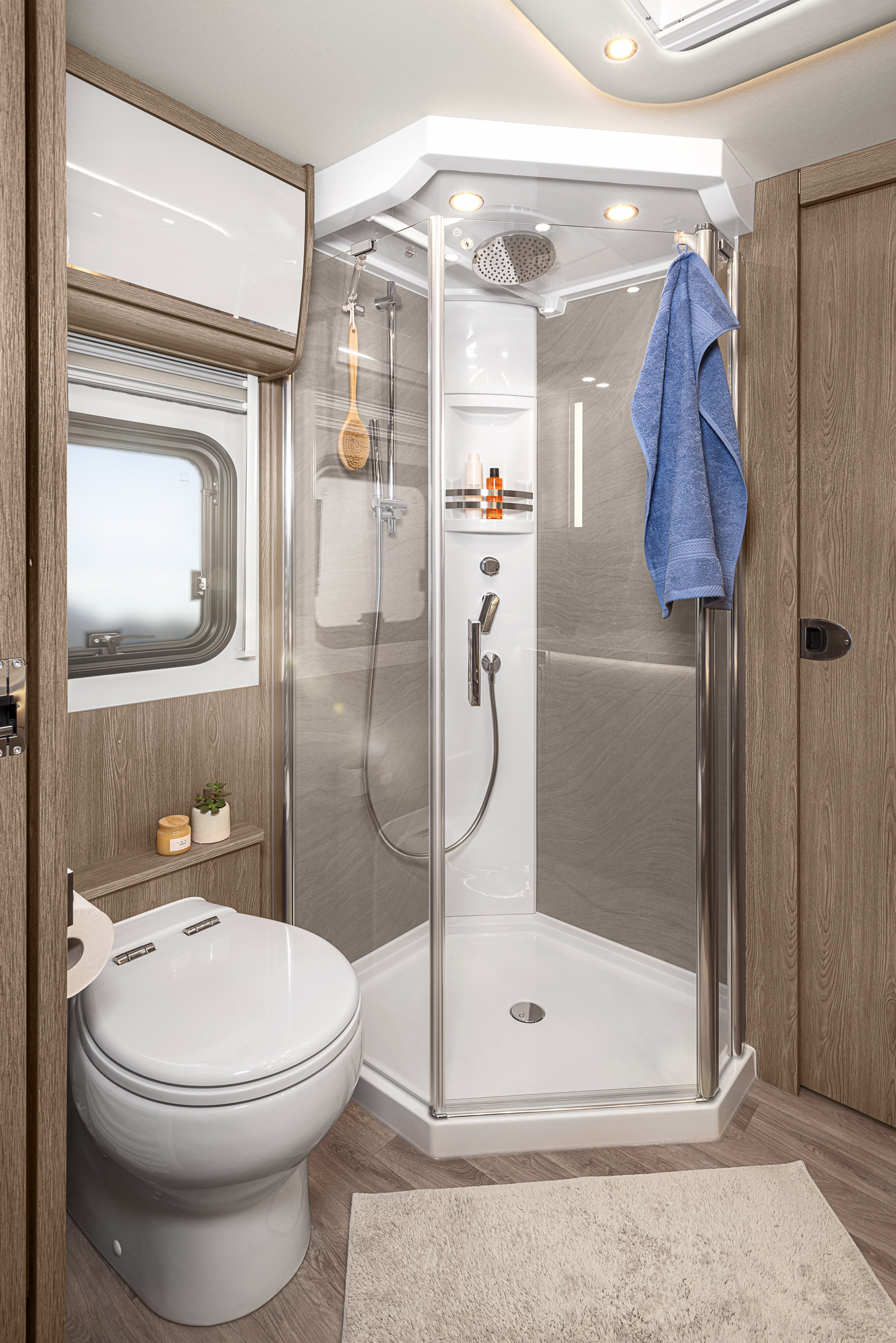 W kamperze znajduje się przestronna łazienka, wyposażona m.in. w toaletę, umywalkę z lustrem, szafki na kosmetyki i akcesoria łazienkowe. Na przeciwko łazienki znajduje się duża, wygodna kabina prysznicowa.